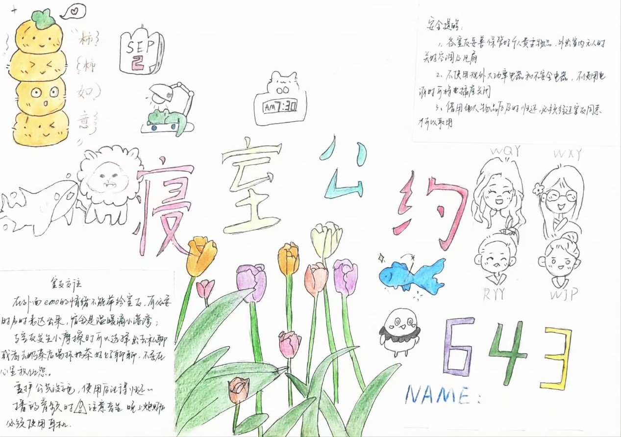 以诚相待共绽情谊之花,依规而行守护和谐之寓。为强化寝室成员的规则意识,激发创新创造活力,营造文明和谐的居住环境,我院社团联合会秘书处和学生会生活事务部联合举办“公约共筑,和谐之寓”寝室文化暨杉书别苑“一站式”学生社区系列活动。此次活动以寝室文化为主题,通过手绘寝室公约海报设计,展示寝室文明风貌,形成师生互动、寝室联动的文化氛围。以画传约,心连心共育寝室之谊;从知到行,手牵手筑牢规则之基。投票环节火热开启啦!快来瞧瞧这些凝聚着心血与创意的海报吧~每一张都有独特的故事与创意!