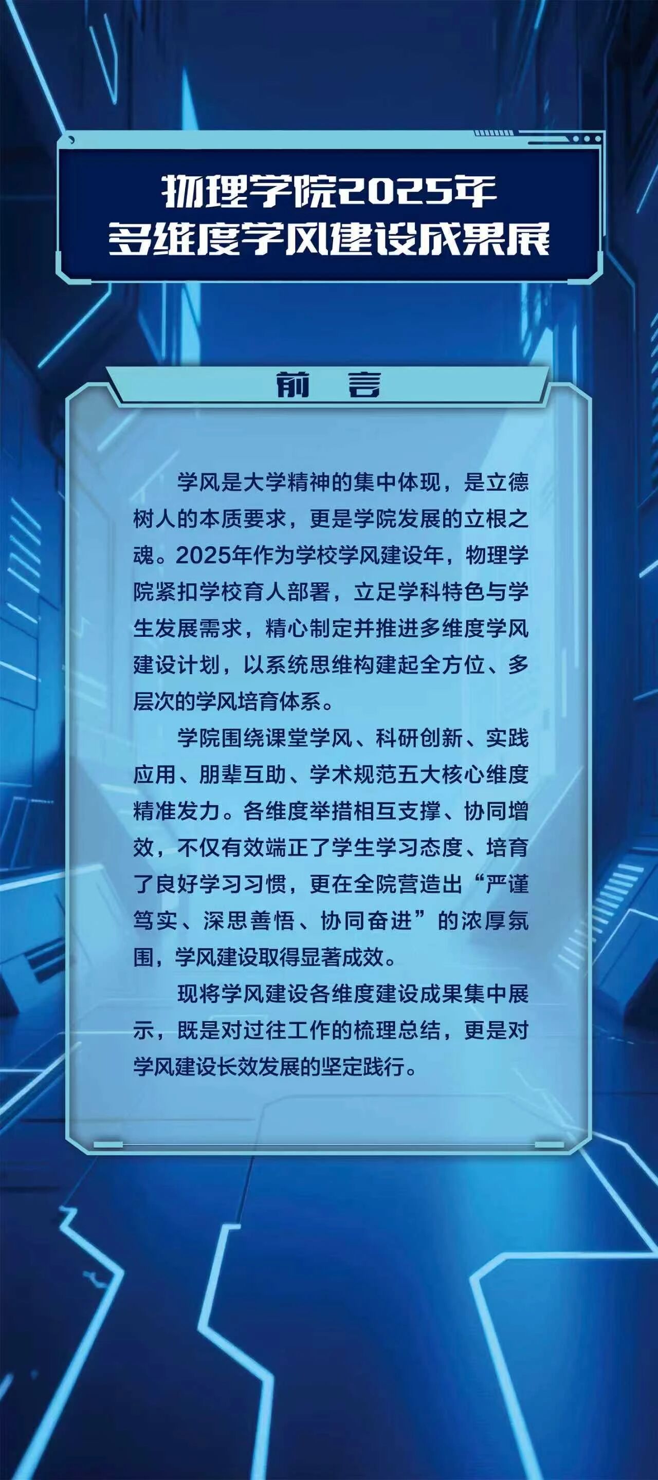 此次“多维学风·物理印记”成果展,是物理学院一站式学生社区建设与学风建设深度融合的生动实践。下一步,物理学院将以此次展览为契机,持续深化一站式学生社区建设,不断探索学风建设新路径、新方法,以更丰富的载体、更务实的举措,推动学风建设再上新台阶,为培养德智体美劳全面发展的社会主义建设者和接班人提供有力保障。