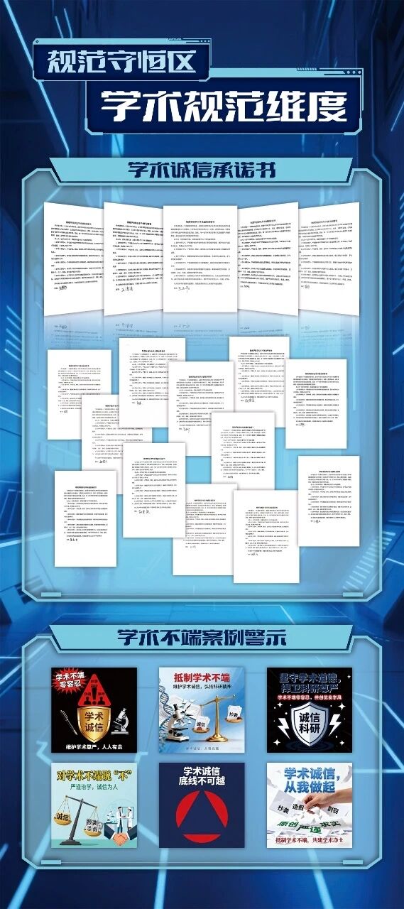 学生签署学术诚信承诺书的庄重照片,展现了学子们坚守学术诚信的坚定决心;学术不端案例警示海报则以直观的方式敲响警钟,引导学生树立正确的学术观。展区通过正向引导与反面警示相结合的方式,强化了学生的学术规范意识,为营造风清气正的学术环境奠定了坚实基础。
