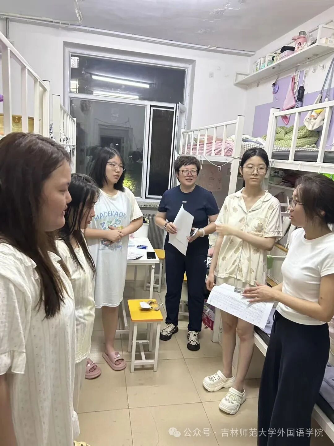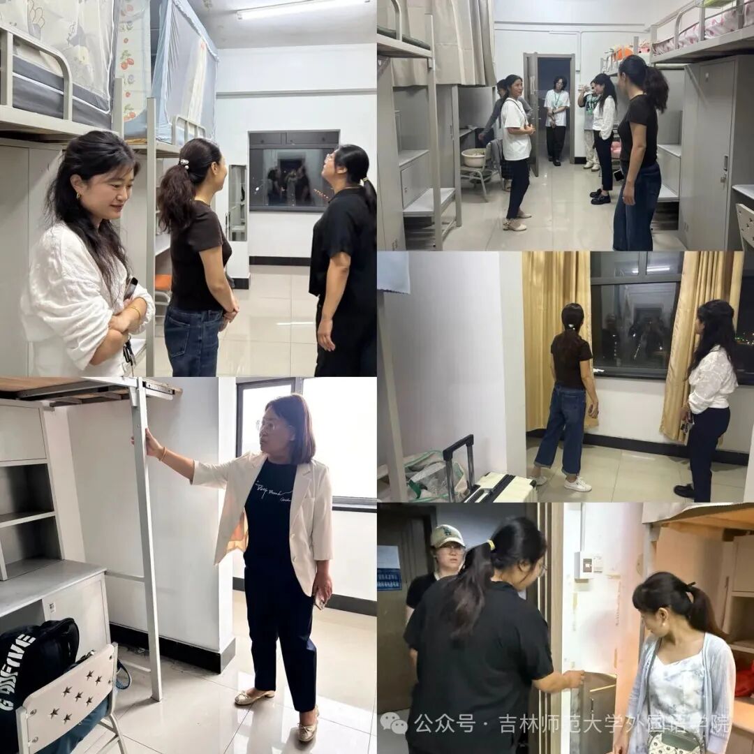为保障 2025 级新生安全有序入住,及时了解入学适应情况,传递学院关怀与温暖,8 月 30 日晚,外国语学院组织开展新生寝室夜间走访活动。党委书记刘天浩带队,副书记胡晶,副院长赵岩、李艳红、于博,院办副主任王一涵,团委副书记范妙然,学工办副主任毛健萍及辅导员陈建飞、柳铭钰、刘心竹深入新生宿舍走访慰问,将学院的牵挂与暖意送到每一位新生身边。