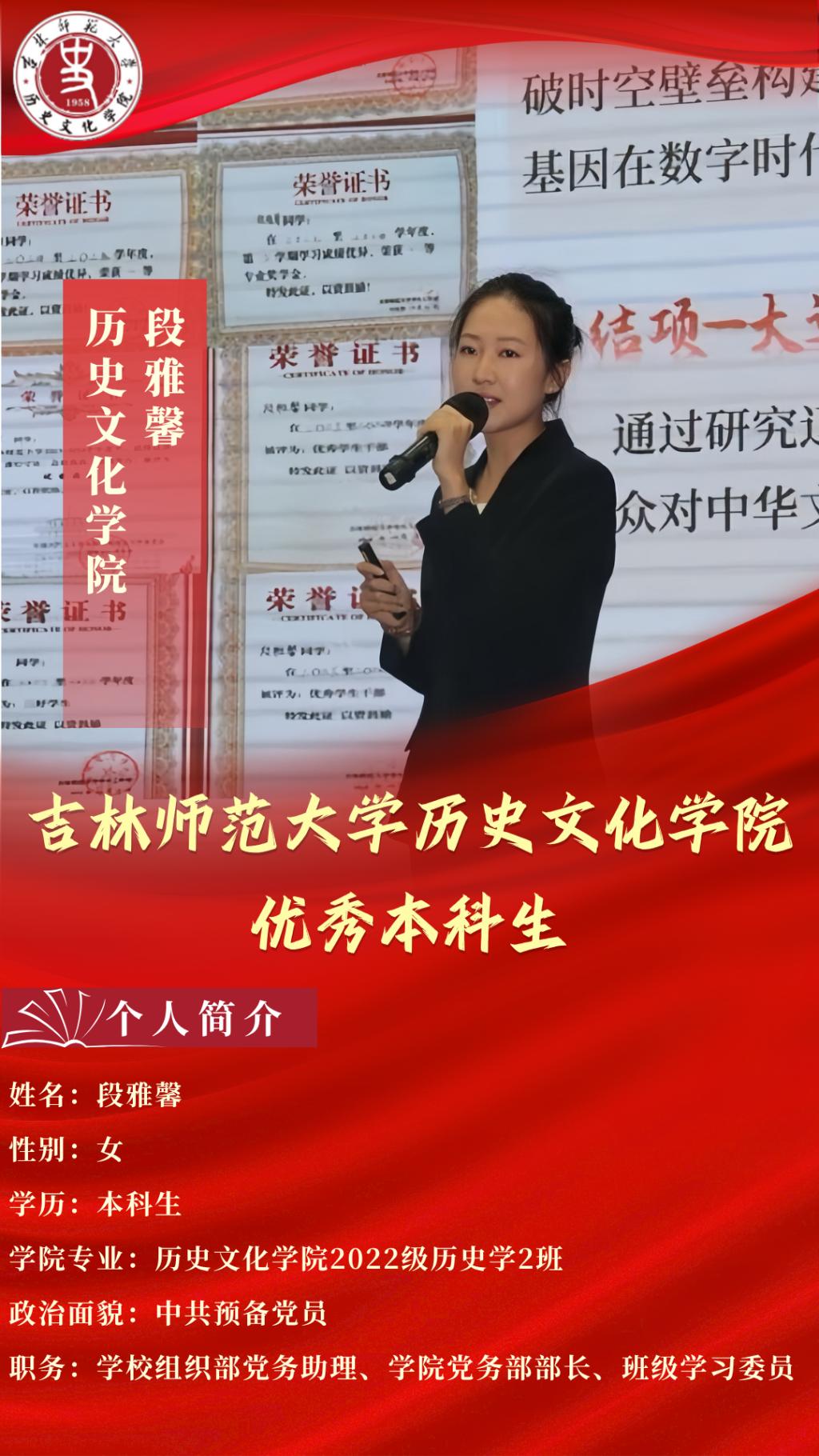 行远自迩,笃行不怠。在专业学习上,段雅馨同学以严谨务实的态度深耕知识,成绩稳居年级第三名,成功推免至东北师范大学世界史方向深造。荣誉层面,她斩获2024年国家奖学金,还多次荣获一等专业奖学金与“三好学生”称号。积极参加21世纪杯英语演讲比赛、第19届“挑战杯”红色专项项目、“互联网+”大学生创新创业大赛等活动,提升个人能力。其中,她牵头的“各美其美,美美与共——辽代器物所见‘中华’文化认同”项目,获2024年全国大学生创新创业训练计划省级项目并顺利结项;同时以核心成员身份加入国家级大创项目“红途智览”,尝试用 AR 技术、器物研究活化红色基因、讲好文化故事,在实践中解锁历史传播新范式。