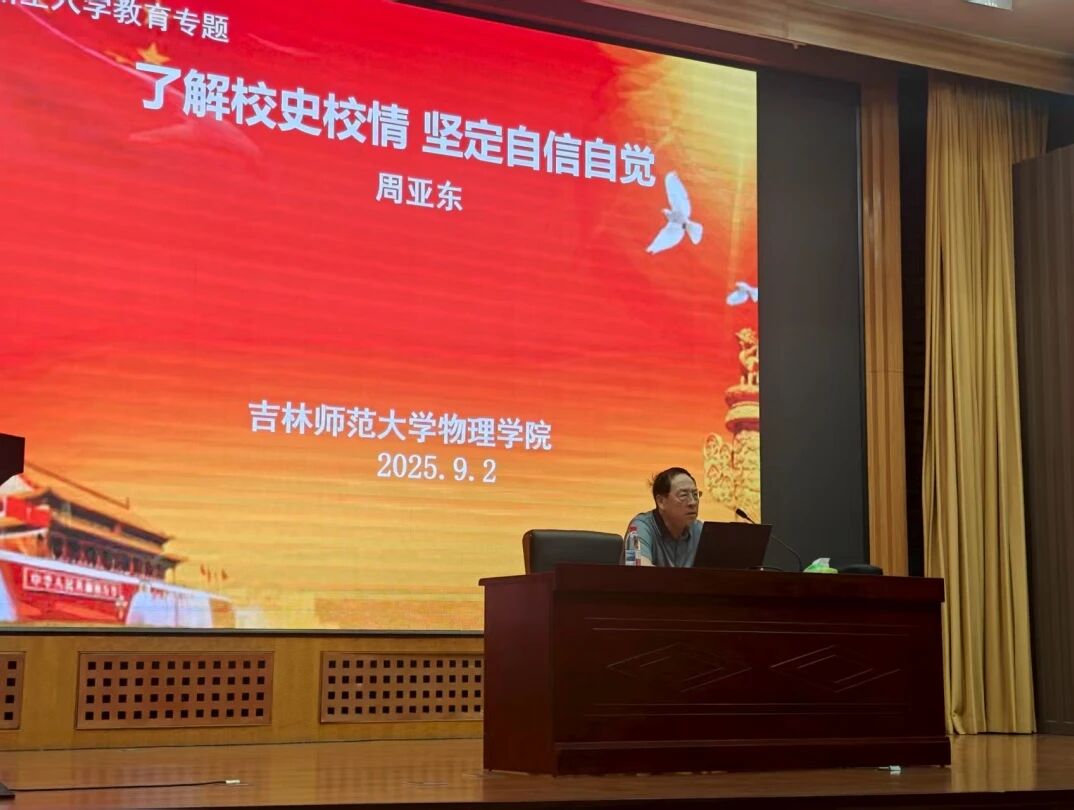 为增强2025级新生对学校的荣誉感与归属感,物理学院于9月2日下午两点在图书馆报告厅一举办了“青心伴新途,护航启新程”系列活动(一)——“知校史立初心”专题讲座。本次活动特邀马克思主义学院关工委常务副主任周亚东教授担任主讲人。