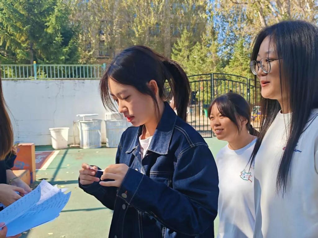 在体育场的接力问答环节中,同学们配合默契、思维敏捷,完成知识问答。