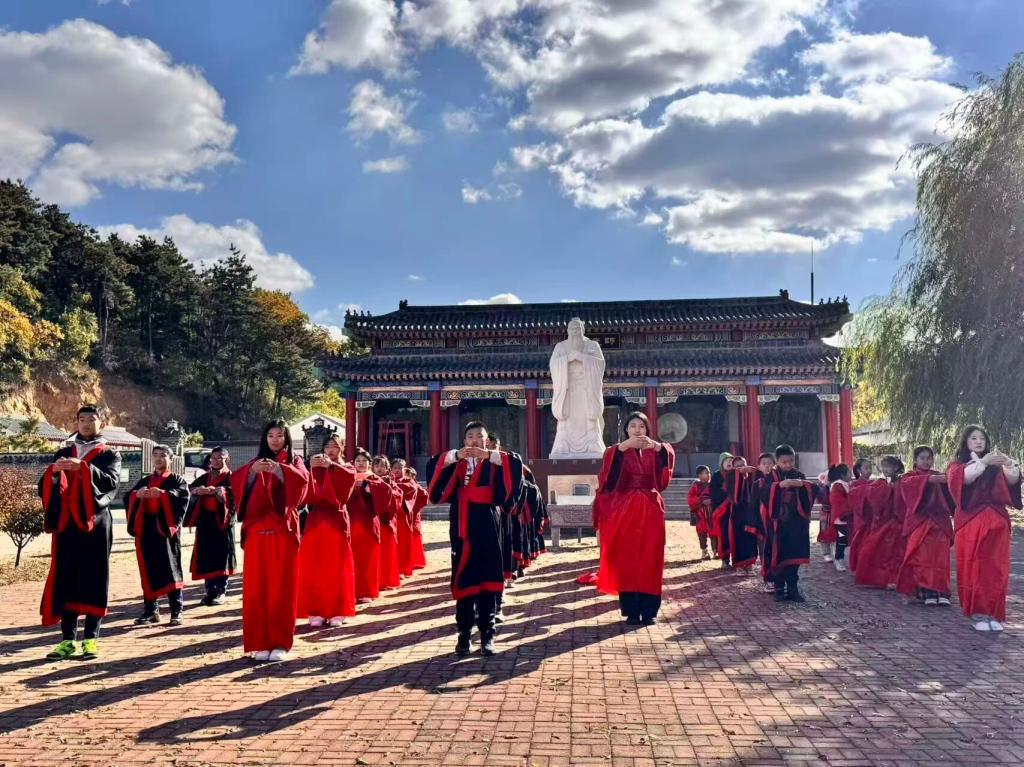 拜孔子像:随后,活动进入庄重的圣贤文化探寻环节。小朋友们身着传统服饰,跟随老师来到孔子像前,认真学习传统作揖鞠躬礼,稚嫩的动作里满是对先贤的崇敬。步入孔子大殿,老师结合生动的历史故事,娓娓道来孔子的生平事迹与思想精髓,古老的故事与稚嫩的倾听交织,让传统文化的韵味在大殿中静静流淌。