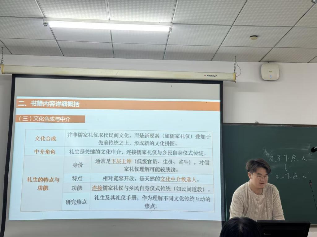 安基赫同学从宏观总体上把握这本书,为同学们全面地介绍了书籍的基本内容与核心思想——儒家礼仪步入乡民生活“礼下庶人”的过程、反应以及背后的深层原因,结合书籍内容提出了两个认识:一,历史的主体是民众;二,实践本身即是史料。细致剖析了作者的历史人类学研究视角。