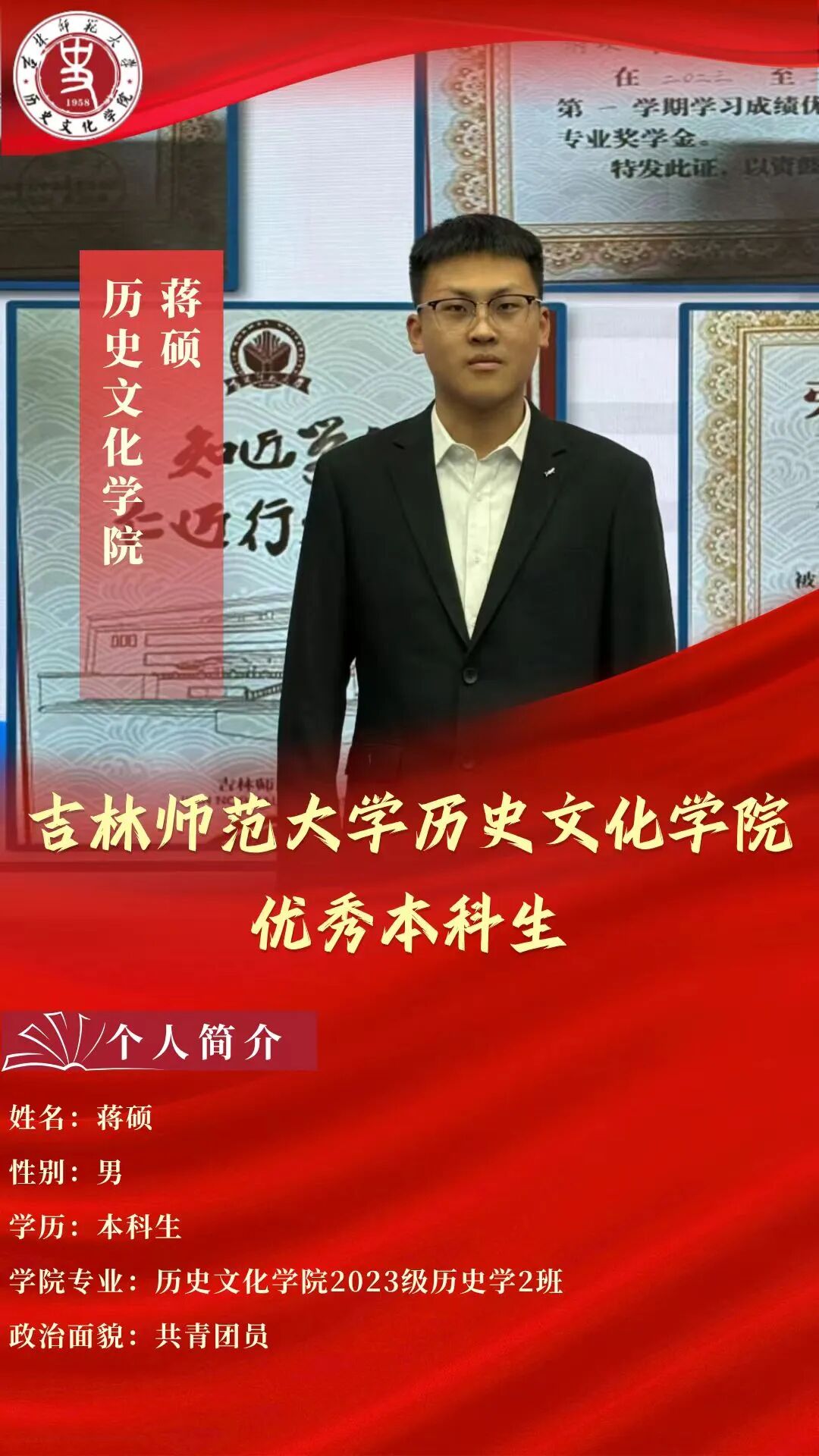 学业方面,蒋硕始终秉持严谨求真的态度,专业成绩连续位列年级前10%,他曾获国家励志奖学金、多次一等专业奖学金及“三好学生”荣誉。课余积极参与“挑战杯”红色专项项目、“互联网+”大学生创新创业大赛等活动;积极学习教师职业技能,在历史文化学院第一届“青衿杯”本科生教学技能大赛中获得二等奖;努力学习历史知识,在四史知识竞赛中取得二等奖;参与主持的项目“史越通鉴—初中生历史互动视频教学创新”荣获2025年全国大学生创新创业训练计划项目省级立项;主持项目“史家春秋道不尽,廉吏新诵鉴古今”通过讲述廉吏一生为官、做人跌宕起伏的经历,感受时代所赋予的个人的使命,传颂中华民族的美德和弘扬中华优秀传统文化。