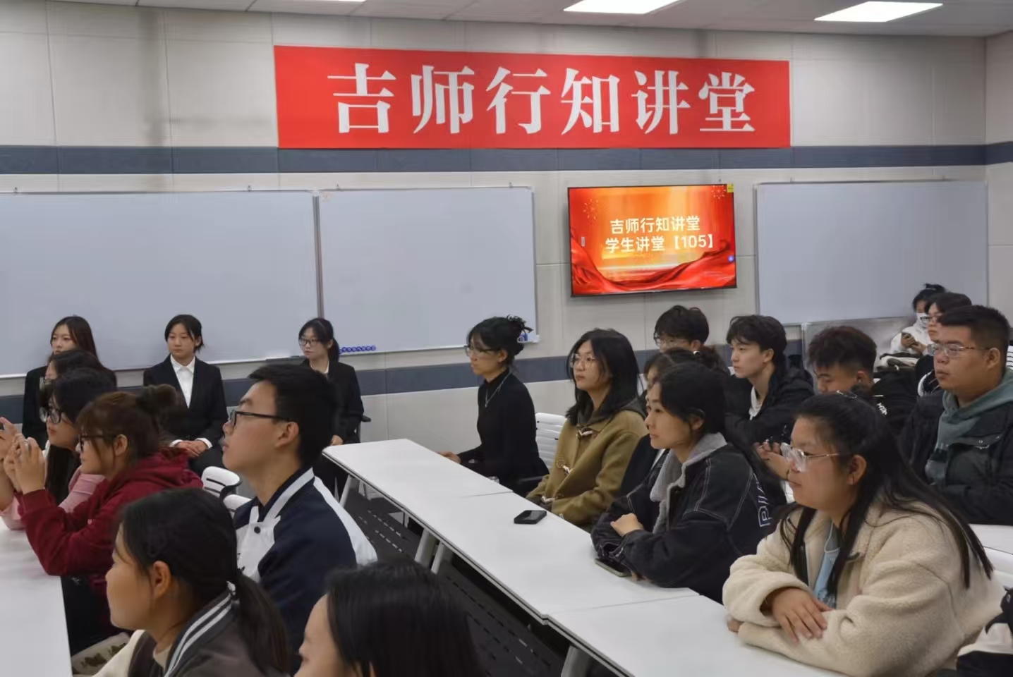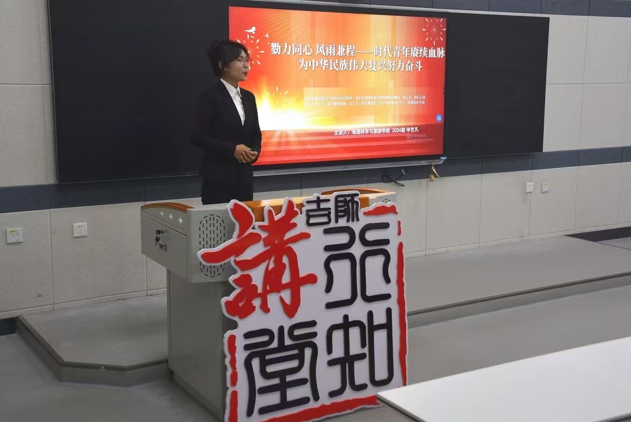 近日,“吉师行知讲堂·学生讲堂”第105期《勠力同心 风雨兼程——时代青年赓续血脉,为中华民族伟大复兴努力奋斗》在大学生创新创业中心328室举办。地理科学与旅游2024级地理信息科学专业毕艺凡同学担任主讲,孔祥玲老师担任特邀访谈嘉宾。本期讲堂通过回顾中华民族的历史来阐述中华民族精神的伟大以及青年在不同历史时期的奋斗精神,鼓励我们新时代青年更加坚定理想信念,为中华民族伟大复兴努力奋斗。