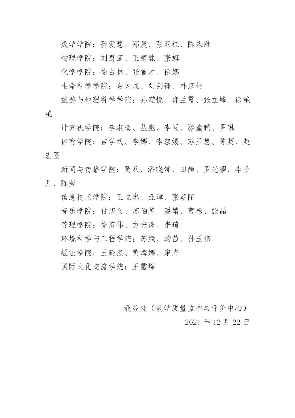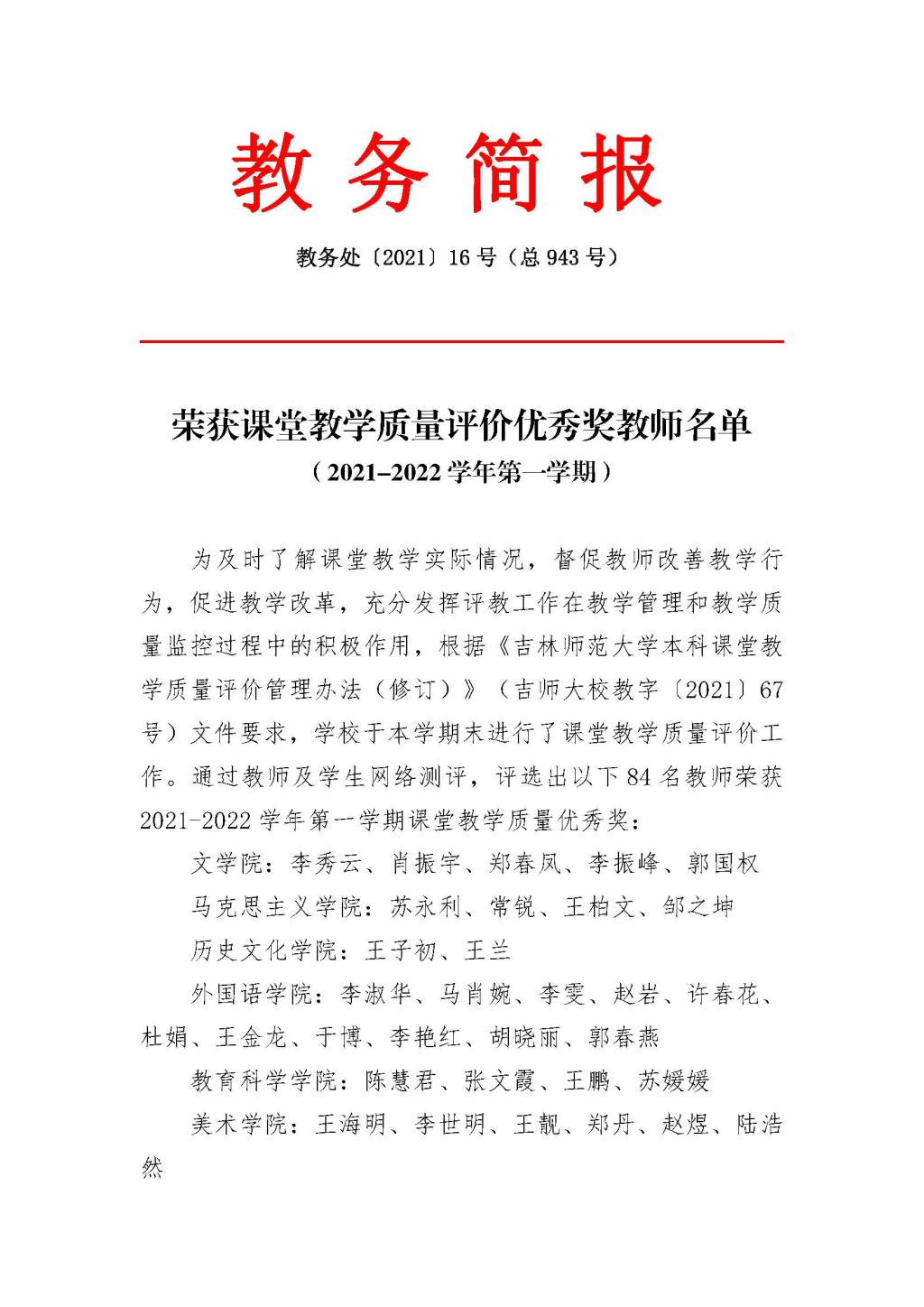 荣获课堂教学质量评价优秀奖教师名单 (2021-2022 学年第一学期)
