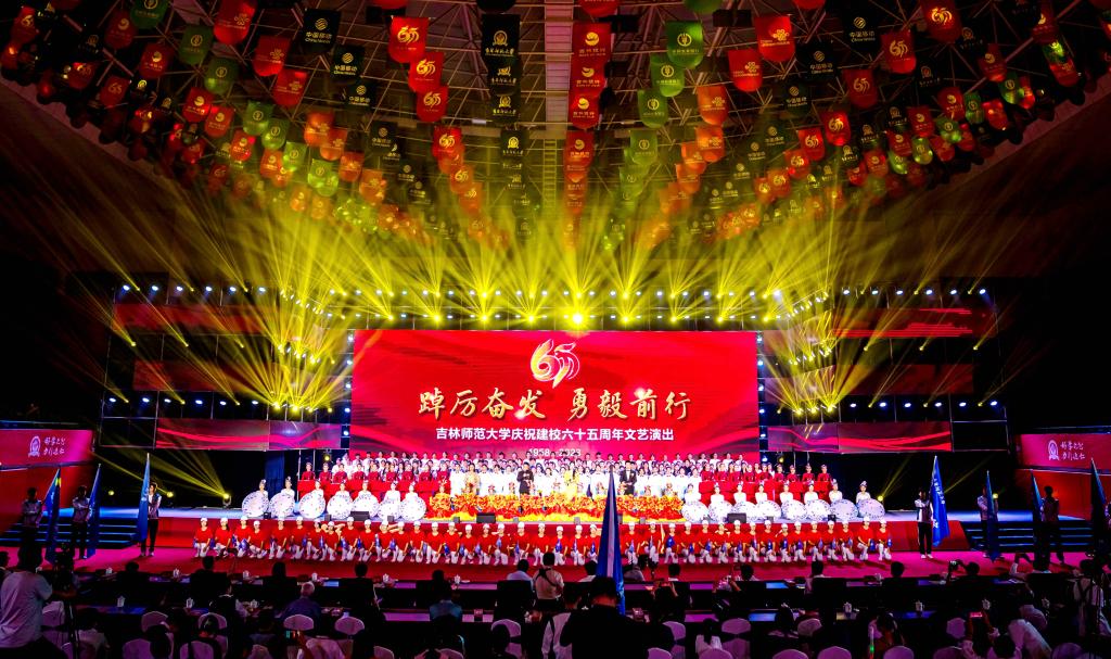 演出以歌舞、合唱、乐器演奏、创意舞蹈展示等多种形式全方位展示了全校师生拼搏进取、善于创新、自强不息的精神风貌。气势恢宏的学校65周年宣传片,立体呈现了吉师65年的光辉历程,彰显了吉师人为党育人、为国育才的不懈追求和深厚情怀;小合唱《我和我的祖国》,由退休教师、青年学生和少先队员三代人联袂演唱,深情表达了吉师人浓浓的爱国情和拳拳的报国心;校旗传递《弦歌永续》创意新颖,不同时期的校旗、17个学院的院旗在璀璨的聚光灯的映衬下熠熠生辉,生动表现了吉师人与学校荣辱与共,休戚相关的血肉深情。演出现场,荣获吉林省首届教育世家称号的陈铁楠老师一家人的感人采访,获得师生的阵阵掌声,新一代吉师人也将传承好、发扬好吉师师者的光荣传统,坚决扛起时代使命,展现青春担当,续写育人华章。歌伴舞《相亲相爱》,昭示着新时代的吉师人将继续勠力同心,苦干实干,朝着特色鲜明、多学科协调发展的高水平师范大学目标阔步前进。